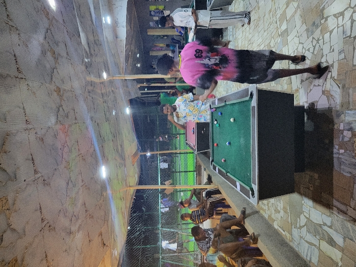 An indoor billiards game in progress, featuring a person in a pink tie-dye shirt leaning over a table with several balls. Another person in a patterned shirt watches from the side. Other individuals are scattered around the room, some seated near a fenced outdoor area. The floor is patterned, and overhead lighting fixtures are visible.