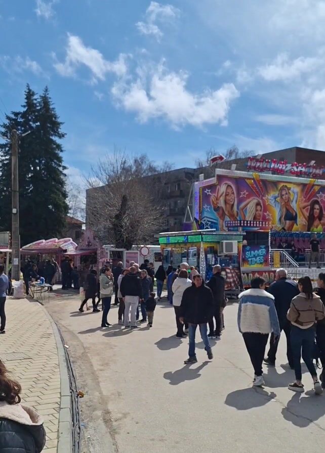 Here's a concise description of the video: The video shows a lively fairground scene during the daytime