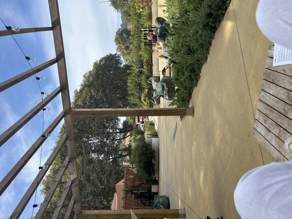 An outdoor leisure area in Colares, Portugal, is depicted under a clear, bright sky with scattered white clouds. The scene is viewed from a low, seated perspective, showing the observer's white-clad legs and a wooden slatted table in the immediate foreground, upon which a document rests. Overhead, a wooden pergola structure supports a string of exposed-bulb lights. The ground is a light yellow-tan paved surface, featuring a visible drainage grate. To the left, a building with a terracotta-colored roof is partially visible, featuring an outdoor section with woven partitions and potted plants. Towards the mid-ground, a pathway extends between cultivated garden beds containing various green shrubs and flowering plants, some in raised, light-colored planters. On the right side of the image, two individuals are observed lounging on dark green bean bag chairs, several of which are branded "San Miguel." One person, with long dark hair, is semi-reclined, while the other is also in a relaxed position. A small, low white table is positioned near them. Beyond the cultivated areas, numerous large, mature trees with dense green foliage dominate the background, suggesting a natural or park-like environment. Vehicles are faintly visible in the distance beyond the pathway.