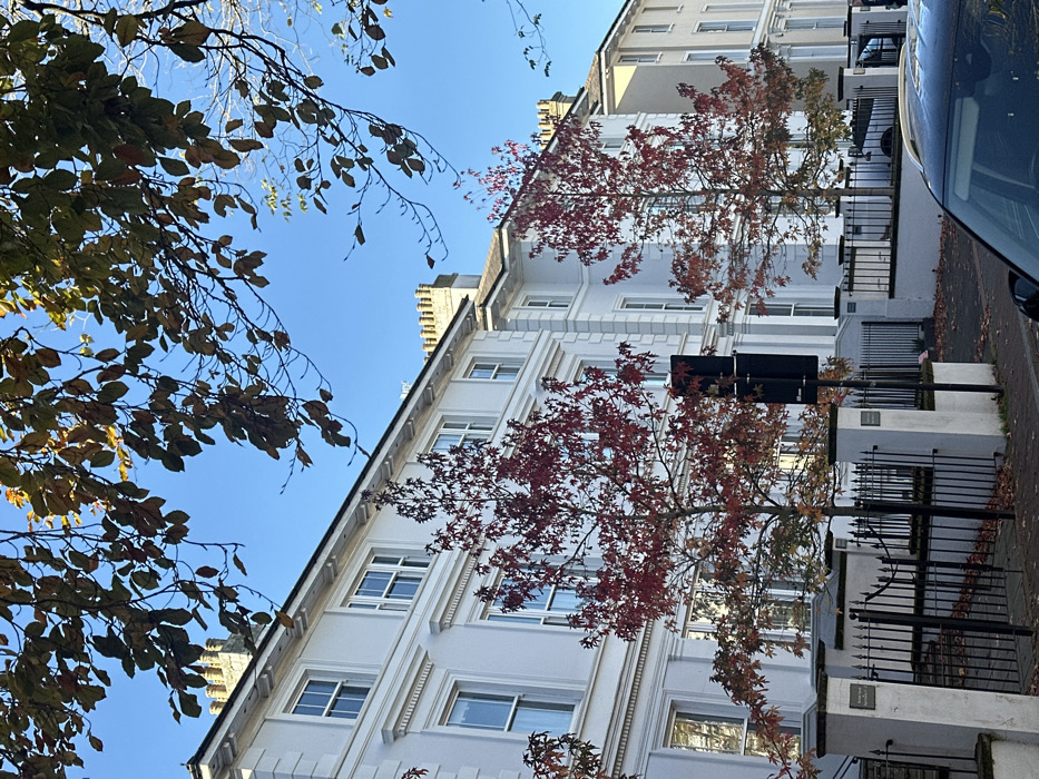 The image depicts a row of three-story terraced residential buildings on Lansdowne Place, Tunbridge Wells, United Kingdom, under a clear blue sky. The structures feature white stucco facades with prominent architectural cornices, sash windows, and individual chimneys with decorative pots. Black iron railings and gates enclose front garden areas, with white stone pillars supporting the gates. Two white stone gateposts are visible in the foreground on the left, one bearing the inscription "Lansdowne House" and the other "Lansdowne Place." Several deciduous trees with predominantly reddish-brown autumn foliage stand in front of the buildings, obscuring parts of the facades. Branches with green, yellow, and brown leaves from a larger, unseen tree extend into the upper frame. The foreground includes a pavement on the left, scattered fallen leaves, and the roof and windshield of a dark-colored vehicle on the right. A black utility pole with a black square sign attached is positioned near the street. No individuals are present.