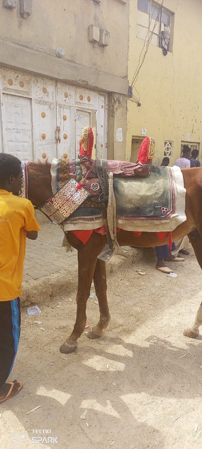 In Tudun Wazurchi, Nigeria, a brown equine, likely a horse or donkey, stands facing left on an unpaved, sandy street. The animal is equipped with an ornate saddle, comprising a multicolored blanket in red, green, and white patterns, overlaid with a more elaborate dark red and silvery-gold saddle structure. A decorative metallic, possibly silver, filigree panel is attached to the left side of the saddle. Two red and gold ceremonial boot-like elements protrude vertically from the saddle's top. Red triangular fabric fringes are visible beneath the blanket. A person, with their back to the viewer, stands on the left side of the frame, near the equine's head. This individual wears a bright yellow short-sleeved shirt and dark pants with blue vertical stripes. Their feet are covered by brown sandals. The background features two buildings. On the left, a light beige or tan-colored building presents a large, weathered white double metal gate adorned with circular patterns and some faint markings. Above the gate, the wall exhibits concrete ledges and a caged white wall light. Adjacent on the right, a brighter yellow building features a multi-paned window, from which a white fabric or bag hangs. Electrical wires are strung across this wall, connecting to a junction box. The ground is a mix of dirt and sand, with scattered refuse including plastic wrappers. In the far right background, several indistinct individuals are partially visible. The scene is brightly illuminated by direct sunlight, casting distinct shadows of the equine and other objects onto the ground.