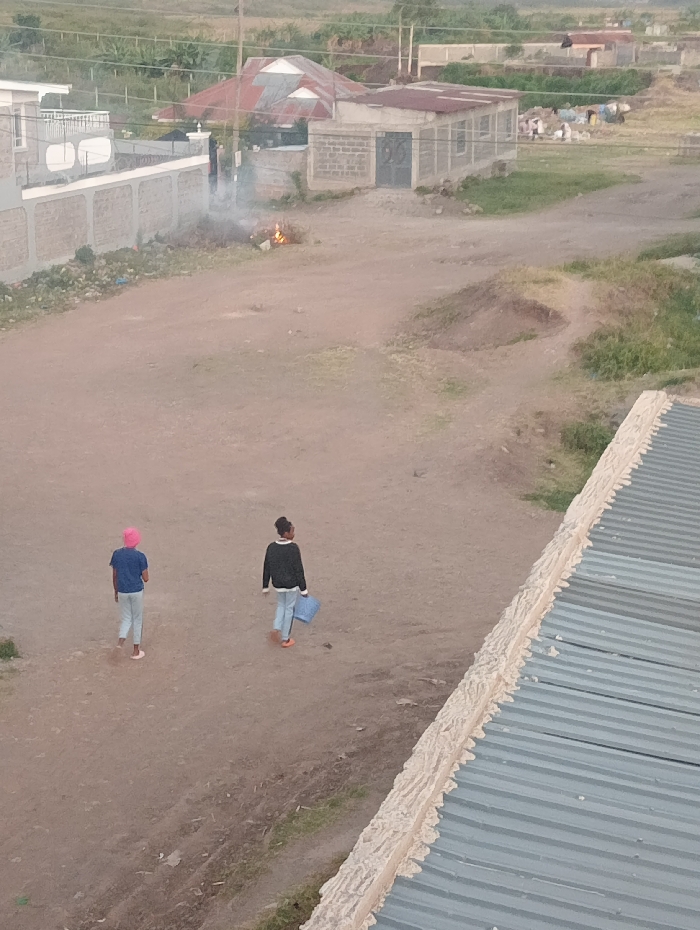 Two people walk away from the camera on a dirt road. The person on the left wears a pink head covering and blue shirt. The person on the right wears a dark sweater and carries a blue bucket. A fire burns near a cement wall in the distance. Several structures and homes are visible in the background. Part of a corrugated metal roof is in the lower right corner.