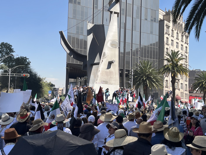 A daytime outdoor scene shows a large crowd of people, many wearing straw hats, gathered in front of a modern building with an abstract sculpture. They hold Mexican flags and signs, suggesting a protest or demonstration. Palm trees frame the right side of the image, and a traffic light is visible on the left. The overall impression is a large gathering expressing a unified message.