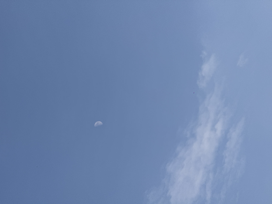 This image captures a daytime sky scene over Mexico City, Mexico. The upper two-thirds of the frame present a clear, light blue sky. A waxing gibbous moon, displaying approximately half illumination, is prominently visible in the upper-central left portion of the sky. The lower third of the image features a scattered formation of wispy white clouds. A small, dark red, unidentifiable object is visible in flight within the lower-right quadrant, positioned above the cloud line. No human figures or discernible ground features are present.