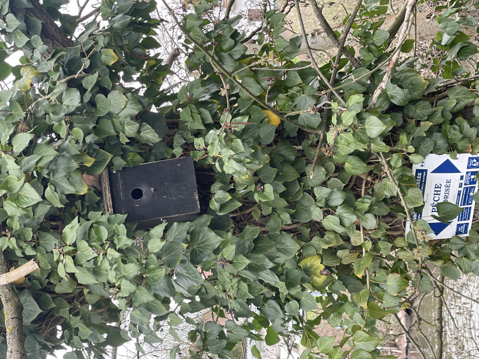 The scene depicts a tree trunk in Holtzheim, France, heavily covered by dark green ivy with visible dark berries. A weathered, black wooden birdhouse is affixed to the tree, positioned slightly to the left of the trunk's center, featuring a single circular entrance hole on its front panel. Below the birdhouse, a partially obscured white and blue sign is attached to the tree. The visible text on the sign includes "ASSOCIATION AGRÉÉE" and "PÊCHE INTERDITE" (Forbidden Fishing), with a white arrow pointing left and a fish icon. The background shows bare tree branches against an overcast sky, and a body of water is partially visible in the lower-left corner, suggesting a waterside location. No individuals, animals, or active interactions are present in the image.