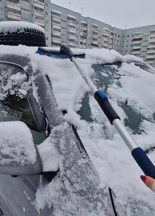 A person uses a long-handled snow brush to remove snow from the windshield of a parked car. The person wears a white glove and has red nail polish. The car is covered in snow. The buildings in the background are tall apartment buildings. The weather is cloudy and snowy.