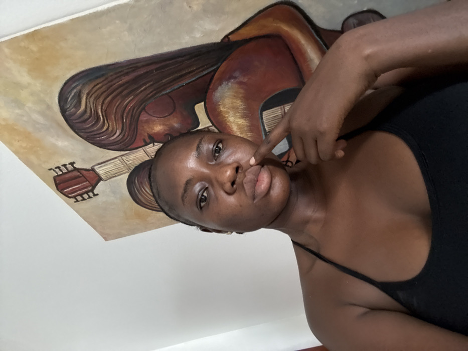 An indoor setting in Lugbe, Nigeria, features a young adult female positioned centrally. She has a dark complexion and dark hair pulled back from her face. She wears a black spaghetti-strap tank top. Her head and shoulders are visible, and she looks directly at the camera with a neutral expression. A small, light-colored stud earring is visible in her left earlobe. Her right index finger is pressed against the center of her upper lip, with her thumb partially visible beneath her chin. Behind her, to the right, a large rectangular painting hangs on a light-colored wall. The painting depicts a stylized profile of a figure, likely female, with long, dark hair, an earring, and a portion of a stringed instrument resembling a guitar visible behind her. The painting utilizes earthy tones including browns, ochres, and reddish hues. The remainder of the background consists of a plain, light-colored wall.