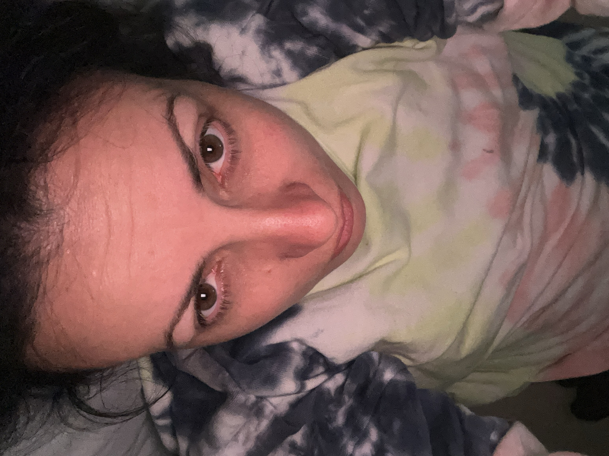 A close-up, dimly lit selfie shows a person with dark hair and brown eyes looking at the camera