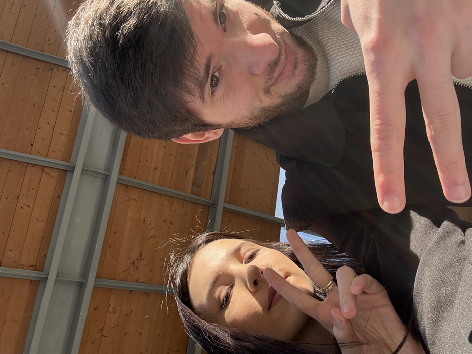 A close-up, low-angle photograph captures two individuals, a female and a male, in what appears to be a selfie. The female, positioned on the left, has dark hair and her face is partially illuminated by direct sunlight. She extends her right hand, displaying a V-sign with her index and middle fingers; a simple gold-colored ring is visible on her right ring finger. She is wearing a dark top or jacket. The male, on the right, has short dark hair and a short beard. He looks directly at the camera with a slight smirk and extends his left hand, also forming a V-sign. He is dressed in a dark jacket over a light-colored, ribbed turtleneck or crewneck sweater. The background features an overhead structure composed of horizontal wooden slats supported by light grey metal beams. A bright, clear sky is visible through openings in this structure, indicating an outdoor or semi-outdoor setting with strong natural lighting. The scene is located in Alfortville, France.