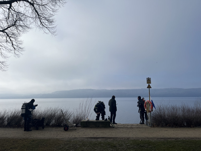 The image depicts an outdoor waterfront scene in Überlingen, Germany, under an overcast sky. Four individuals are present on a dirt path adjacent to a large body of water, likely Lake Constance. Three individuals are dressed in dark diving drysuits with hoods. On the far left, one diver, equipped with twin-cylinder dive tanks, stands next to a black two-wheeled equipment trolley, appearing to adjust their gear. A second diver is positioned centrally, bent over a low, light-colored concrete or stone bench at the water's edge. A third individual, in dark civilian clothing, stands upright between the second diver and a fourth diver, facing the water, and appears to be holding a mobile device. The fourth diver, on the right, stands near a vertical metal pole. This pole displays two yellow triangular warning signs and has a red and white life preserver ring and a blue object attached. Dry, brush-like vegetation separates the path from the water. The calm, greyish-blue water extends to the horizon, where a distant, hazy landmass is visible. The sky is uniformly grey and overcast. Bare tree branches are silhouetted in the upper left portion of the frame.