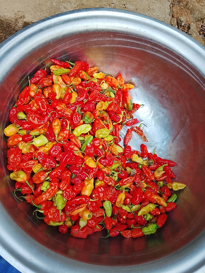 - "A large, reflective metallic bowl, likely aluminum or stainless steel, is filled with a dense collection of chili peppers" by FM-COgBk1, licensed under CC BY 4.0