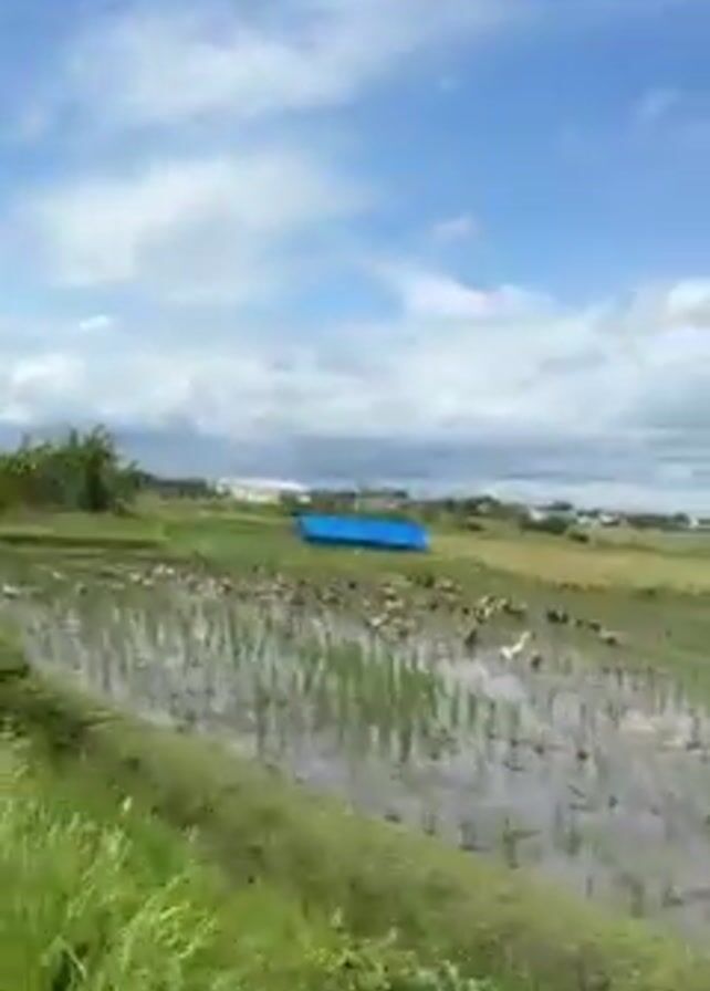 rural landscape with rice paddies in Asia. The camera is moving along a narrow concrete path or road, presumably mounted on a vehicle. The sky is blue with scattered clouds. In the rice paddies, there are ducks wading in the water. The paddies are green with young rice plants and the water is muddy. There is a blue tarp visible in the distance. Banana trees line the path. In the distance there is a small town with houses.