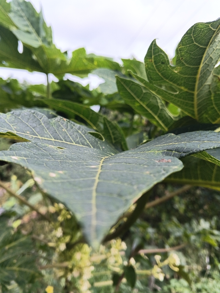 Lush green foliage fills the frame, dominated by large, textured leaves exhibiting distinct venation. Small, delicate yellow flowers cluster near the bottom, blurring into the background. The leaves are mostly in focus, though some are slightly blurred, suggesting depth of field. A cloudy sky is visible through gaps in the canopy.