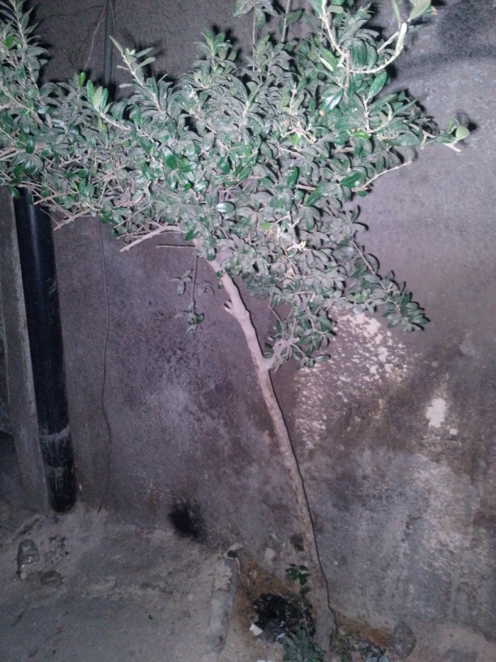 The image displays an outdoor, dimly lit scene located within Barza Municipality, Syria. The central element is a densely foliated, multi-branched plant, consistent with a young olive tree or shrub, approximately 1.5 meters in height, growing from the lower center of the frame and extending upwards and to the right. Its slender, light brown trunk emerges from an uneven patch of soil and debris at the base of a wall. The plant's dark green leaves exhibit a dusty coating, with some small lighter-colored speckles visible on the foliage and branches. The background consists primarily of a dark, textured wall, likely concrete or stucco, displaying varied shades of gray and brown, along with areas of discoloration and lighter, possibly efflorescent, residue concentrated towards the lower right portion. A vertical black pipe, appearing to be a drainpipe or conduit, runs along the left side of the wall from mid-frame downwards, partially obscured by the plant's branches at its upper end. A faint vertical line or crack is discernible on the wall to the left of the plant's main trunk. The ground level at the bottom of the image comprises uneven earth, small stones, and sparse detritus, with a thin, dark linear object, possibly a cable, visible on the ground surface in the lower right. No individuals, animals, or active interactions are present within the frame.