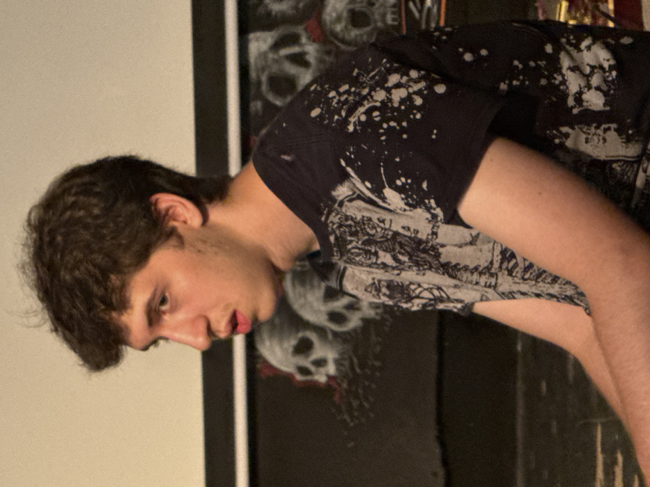 A young male, appearing to be in his late teens or early twenties, is depicted in profile, facing left, with his mouth slightly ajar. He has light skin, short, wavy dark brown hair, and stubble on his chin and jawline. He is wearing a short-sleeved t-shirt; the left half features a grayscale design of intertwined skeletal or organic patterns, while the right half is dark blue or black with white paint splatters. His forearms are visible, bent, suggesting he is seated or leaning forward. The background is dark, featuring multiple gray skull drawings or paintings arranged horizontally, some with faint red accents, beneath a prominent horizontal white band, possibly a screen or projection surface. The environment is indoors, consistent with a casual venue or event space. The specific location in Tel Aviv, Israel, is not discernible from the image data.