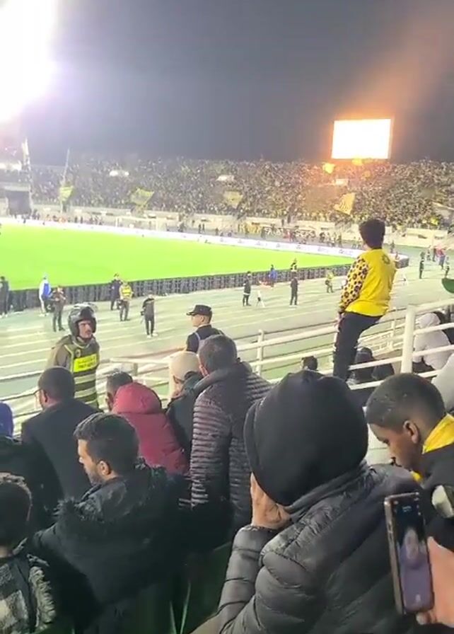 crowded stadium at night. The stands are mostly full, with a large group of fans dressed in yellow. The field is brightly lit and teams appear to be walking around before the start of a match. The camera is situated behind a row of spectators, some of whom are seated. A person wearing a yellow jacket with a black-and-white animal print is standing on a railing in front of the crowd, looking out at the field. Several people are looking at their phones. Law enforcement personnel are visible on the sidelines near the field. A large screen is lit up in the distance.
