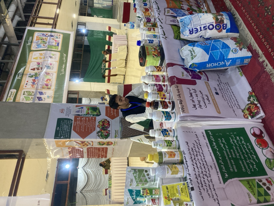 The image depicts an indoor exhibition or trade show focused on agricultural products, taking place in Quetta City Tehsil, Pakistan