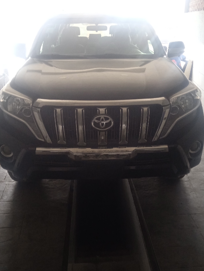 A dark-colored, likely black or very dark blue, Toyota Prado SUV is depicted in a front-facing view, positioned within an indoor automotive service bay