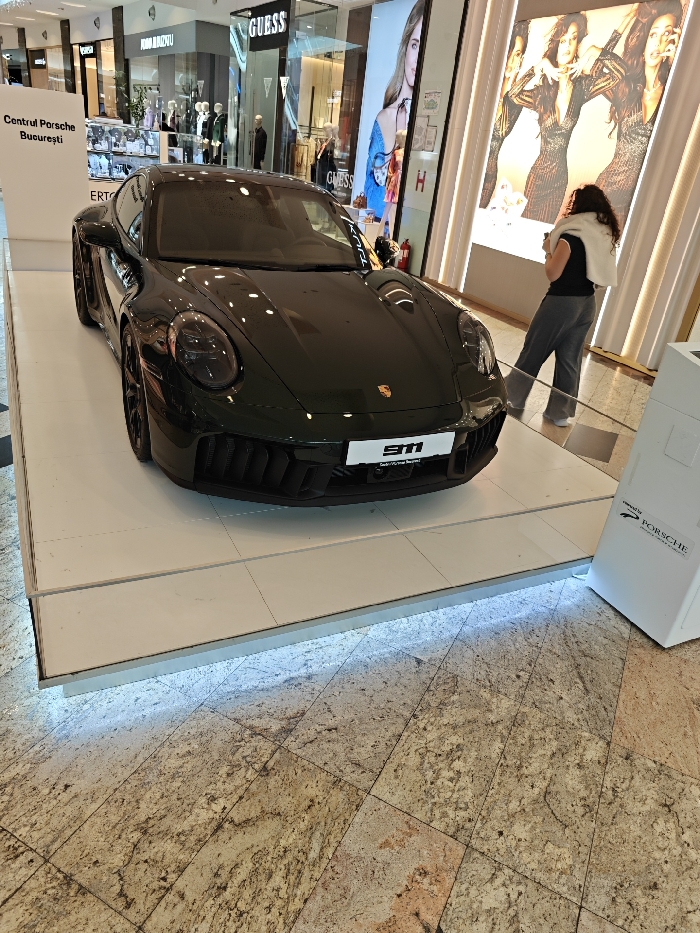 An indoor scene within a shopping mall in Bucharest, Romania, features a dark green Porsche 911 sports car on display