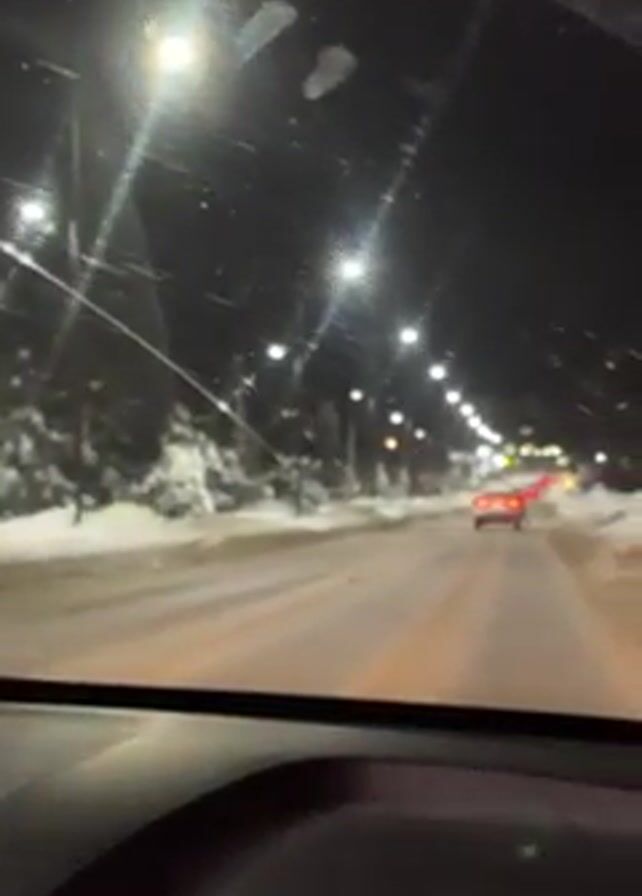 car driving down a snowy road at night. Streetlights line the road, and snow is piled up on either side. Another car drives ahead. The view is from inside the first car, showing the dashboard. There is music playing.