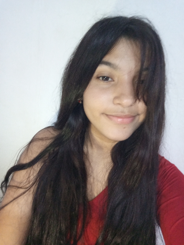 A young woman with long, dark hair partially covering her face smiles at the camera. She wears a red v-neck shirt. Her skin appears smooth. A red earring is visible on her left ear. The background is a plain, light color. The lighting is soft and even, creating a casual and relaxed atmosphere.