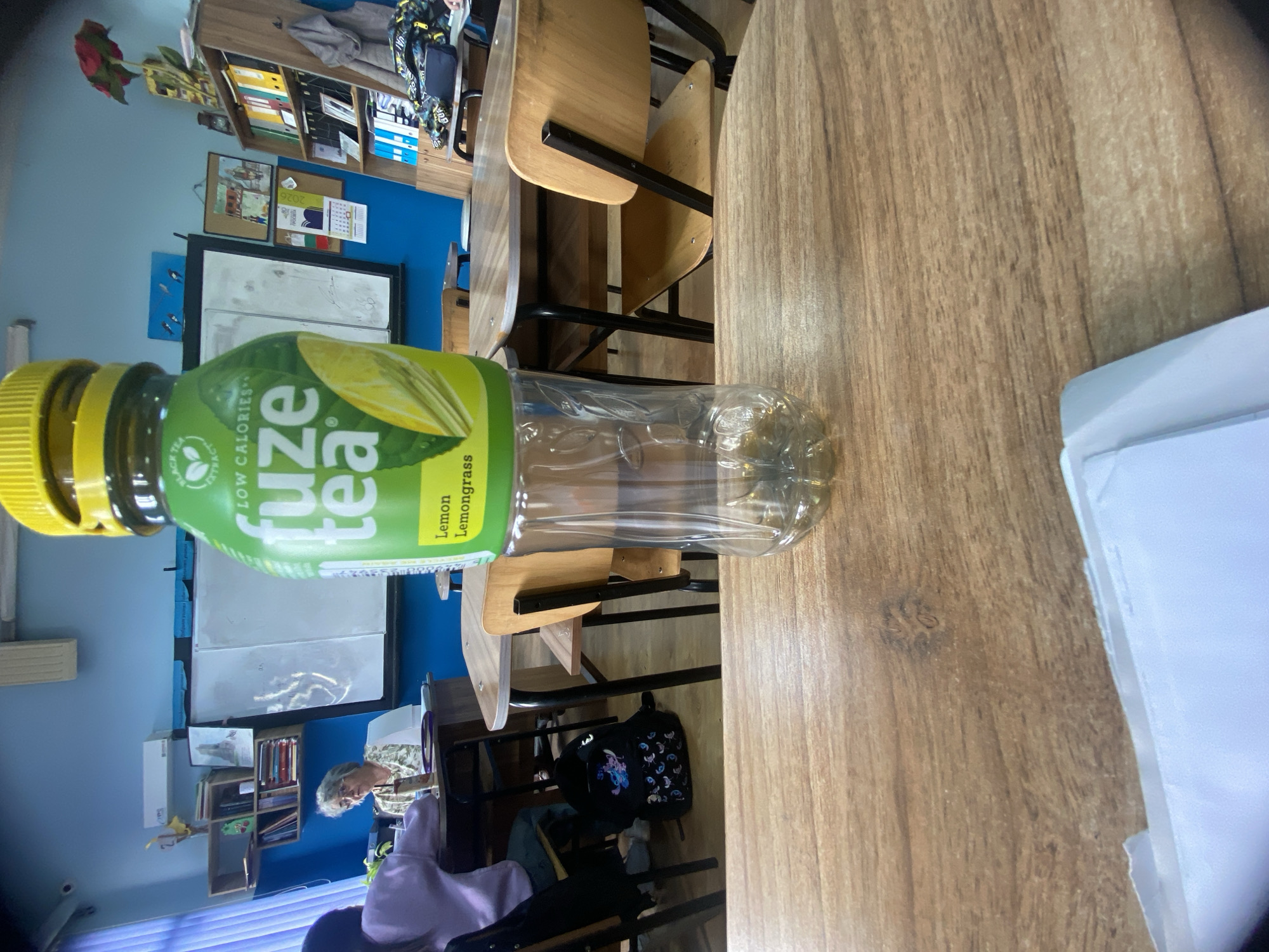 The image presents an interior scene in what appears to be a classroom setting, possibly in Bozhurishte, Bulgaria. A bottle of Fuze Tea Lemon Lemongrass sits horizontally on a wooden desk. Behind the desk are a few wooden chairs. Further back, a woman is visible, seemingly seated at another desk. In the background, there is a whiteboard, shelves with books and files, and other classroom-related items. The scene is somewhat cluttered, and the perspective is skewed.