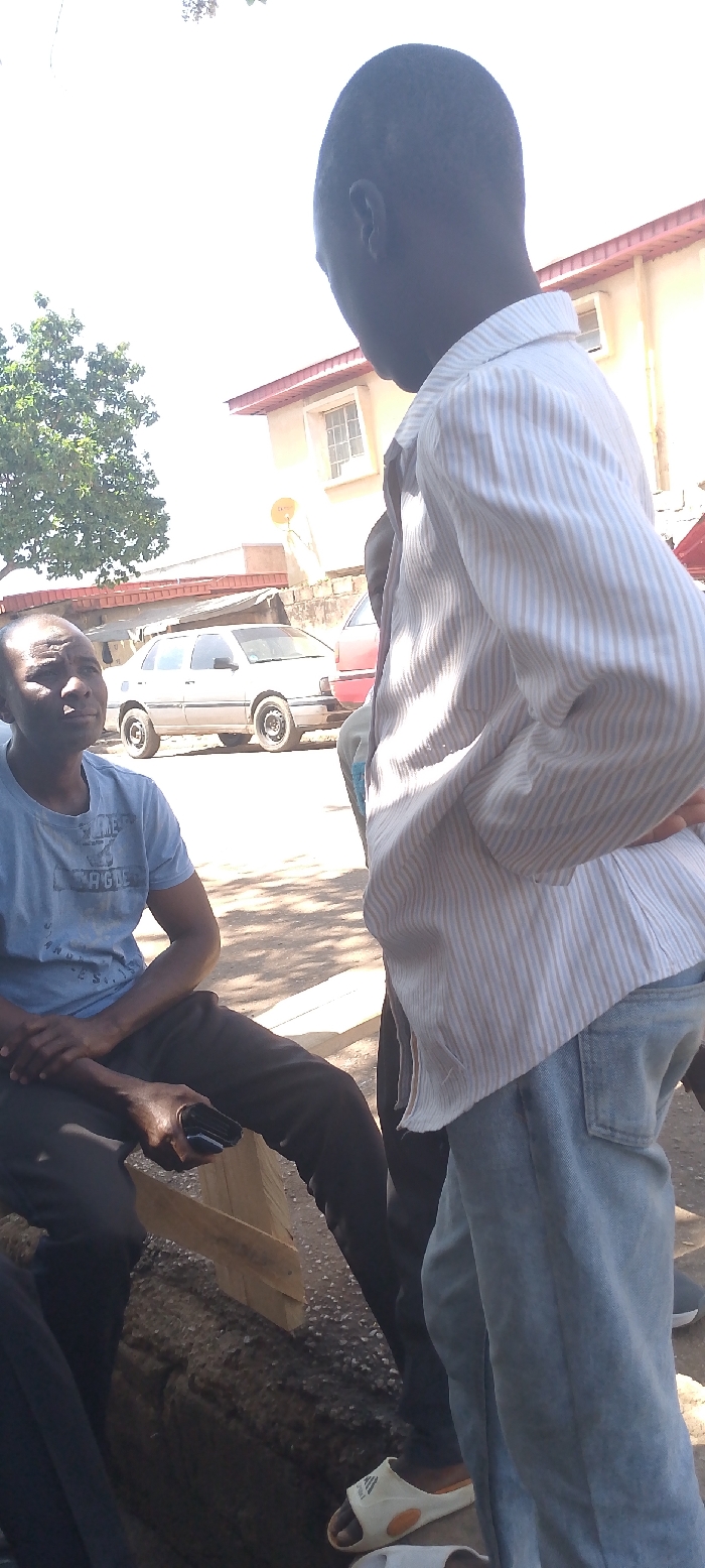 This image depicts an outdoor scene in the city of Unknown, Unknown, under bright, direct sunlight that creates stark shadows. In the foreground, a male individual of African descent stands with his back largely to the camera, his head slightly turned to the left. He is wearing a light-colored, vertically striped button-down shirt with faint blue or grey stripes, light blue denim jeans, and white slides with an orange circular embellishment on each. His hands are out of view, possibly resting on his hips or in his pockets. To the left, a second male individual of African descent is seated on a wooden bench or platform. He is partially obscured by shadows but is looking slightly upwards and to the right. He wears a light blue t-shirt with faded dark text and dark-colored trousers. His hands are clasped, holding a dark-colored wallet or small rectangular object. The ground is composed of dark, uneven soil or gravel, with scattered shadows. In the midground, behind the seated individual, a light silver sedan is parked. To its right, a section of a red vehicle is visible. In the background, a light-colored building with a reddish-brown sloped roof is prominent, featuring multiple windows with frames and a white satellite dish mounted on its exterior wall. A tree with green foliage is visible on the far left of the background, partially obscured by the bright sky.