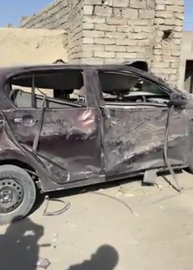 aftermath of what appears to be a vehicle explosion in a desert-like area