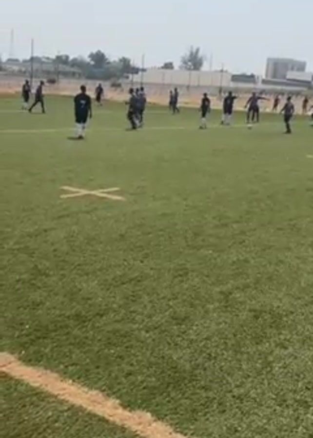 group of people, all wearing dark-colored athletic apparel, participating in a soccer practice on a bright, sunny day. They are spread across a green soccer field with white lines and markings. The camera captures them moving, passing, and kicking a soccer ball. A building can be seen in the background, suggesting the field is part of a sports complex or school.