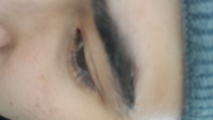 The scene, set in the city of Chinabad, Uzbekistan, captures a close-up, out-of-focus view of a person's left eye and a portion of the adjacent facial skin. The eye is dark and appears partially closed or looking downwards, with visible dark eyelashes. A slight reddish mark is present on the lower eyelid near the inner canthus. A thick, dark eyebrow arches above the eye. The skin is light-toned, showing minor, indistinct blemishes on the cheek area. The upper edge of a gray, ribbed knit beanie or similar headwear is visible at the top of the frame. No discernible actions or interactions are depicted within this static close-up.