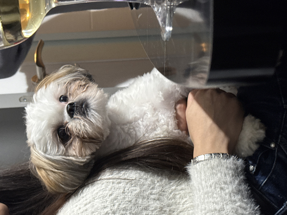 - "The image portrays an indoor scene in Varna, Bulgaria, featuring a person holding a Shih Tzu dog at a table" by FM-K78od2, licensed under CC BY 4.0