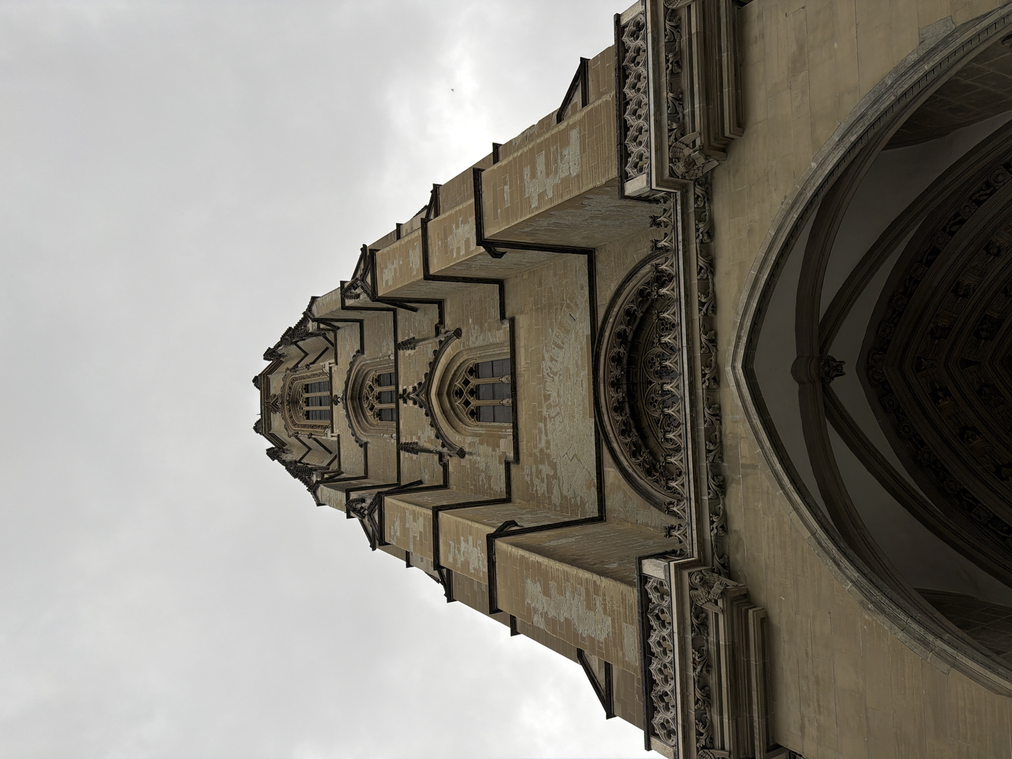 The image displays a low-angle view of the lower and middle sections of the St. Nicholas Cathedral tower in Fribourg - Freiburg, Switzerland, positioned against an overcast, light grey sky. The Gothic architectural structure is composed of weathered, light beige to grey stone blocks. The lowest visible feature is a large, deeply recessed pointed archway. Above this arch, an ornate stone frieze is present, topped by a stone balcony featuring intricate openwork tracery and a sculpted winged figure on the right side. Ascending the tower, multiple tiers of tall, narrow pointed-arch windows with dark panes and stone tracery are visible. These window sections are flanked by prominent vertical buttresses delineated with dark trim lines. No individuals, objects beyond the cathedral, or interactions are depicted in the scene.