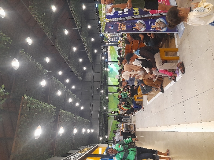 n indoor food court located at latitude -7.607 and longitude 111.904 in Nganjuk, Indonesia. The ceiling is covered with artificial greenery and has many white LED lights. There are people seated at tables and booths on the right side of the frame. A man in a green shirt is standing in the foreground on the left side of the frame. He is looking at the camera. There are multiple booths behind the people. The floor is tiled and there is a white line on the floor, dividing the space into two sections.