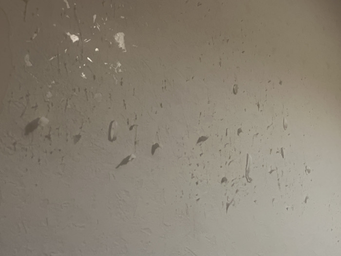 The image presents a close-up of a light beige or off-white textured surface, consistent with an interior wall, exhibiting widespread paint or plaster delamination
