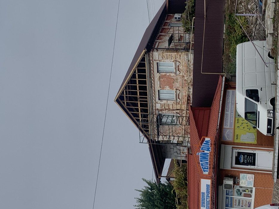 The image captures a multi-level urban scene in Bohuslav, Ukraine, under an overcast light grey sky. In the foreground, a single-story commercial building with a red gabled roof occupies the lower portion of the frame. Its facade features multiple signs in Ukrainian; a prominent central sign in white with blue text reads "ТЕПЛИЙ ДІМ" (Warm House), accompanied by a heart graphic. To the left, signage details "ОПАЛЕННЯ ВОДОПОСТАЧАННЯ" (Heating Water Supply) and lists brands such as "ATON," "Demrad," and "Atlantic." A white entrance door with a glass panel displays operating hours (e.g., "8:00 - 17:00"). To the right, another sign repeats "ОПАЛЕННЯ ВОДОПОСТАЧАННЯ" and adds "МОНТАЖ СЕРВІС РЕМОНТ" (Installation Service Repair), next to a poster advertising "kalde" products. A white Volkswagen Crafter van is parked partially in front of the commercial building, its upper half visible. A sliver of another white vehicle is discernible on the far left edge. Behind and above the commercial building, situated on higher ground and separated by a dark brown corrugated metal fence, is a two-story brick building. This structure appears to be under renovation or construction. Its brick facade shows signs of age, including peeling plaster, exposed bricks, and some cracking. An unfinished gabled roof frame, constructed from exposed wooden beams, forms the attic level, while the primary roof is partially covered with dark brown material. Metal scaffolding is erected against the left section of the brick building's facade, extending upwards. Multiple rectangular windows with light-colored frames are visible on the second floor. To the left of the brick building, an attached section built from light grey cinder blocks is partially visible, topped by a smaller brown roof overhang. Green foliage from trees and bushes is present on the left side, behind the commercial building and adjacent to the upper brick building. Additional vegetation grows along the slope between the fence and the lower building, and on the right side below the fence. A single dark power line stretches horizontally across the upper middle portion of the sky. No individuals are visible in the scene.