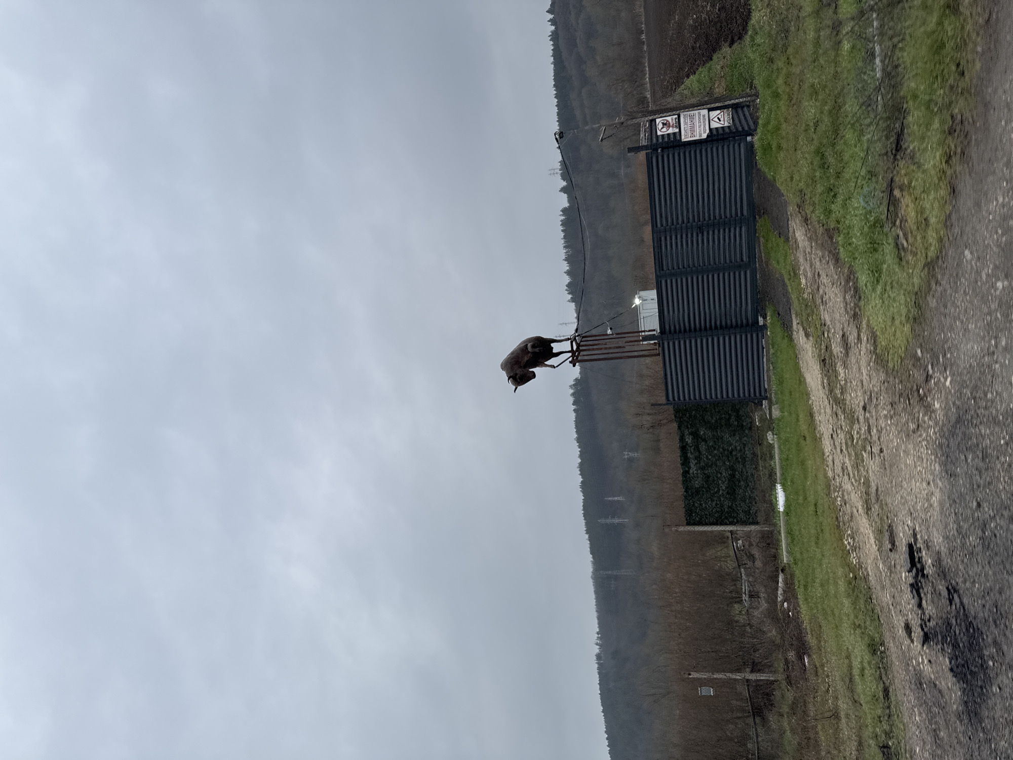 The image displays an outdoor scene in Ushintsi, Bulgaria, under a uniformly overcast, light grey sky. A dark, corrugated metal gate, approximately two meters in height, stands closed, blocking a dirt and gravel road in the foreground. This road exhibits potholes and scattered dark debris. To the left of the gate, a segment of wire fencing is visible, partially enveloped by green and dry brown vegetation. To the right, a dark brown, freshly tilled agricultural field extends into the frame. A dark metallic sculpture of a ram or ibex, depicted standing on its hind legs with its front legs raised, is prominently mounted atop a rusty, vertical metal pole positioned immediately to the left of the gate structure. Two signs are affixed to the right panel of the gate: an upper circular red sign with a crossed-out animal symbol, and below it, a rectangular white sign displaying "ВНИМАНИЕ!" (ATTENTION!) in red Cyrillic text, followed by smaller black Cyrillic text indicating "Обектът е под видеонаблюдение!" (The object is under video surveillance!), and a triangular warning symbol. Beyond the immediate vicinity of the gate, a band of dry, scrubby vegetation separates the foreground from a densely forested hill or mountain range dominating the background. Multiple tall, metal lattice power line towers are discernible within the distant treeline. No individuals or animals are present in the depicted scene.
