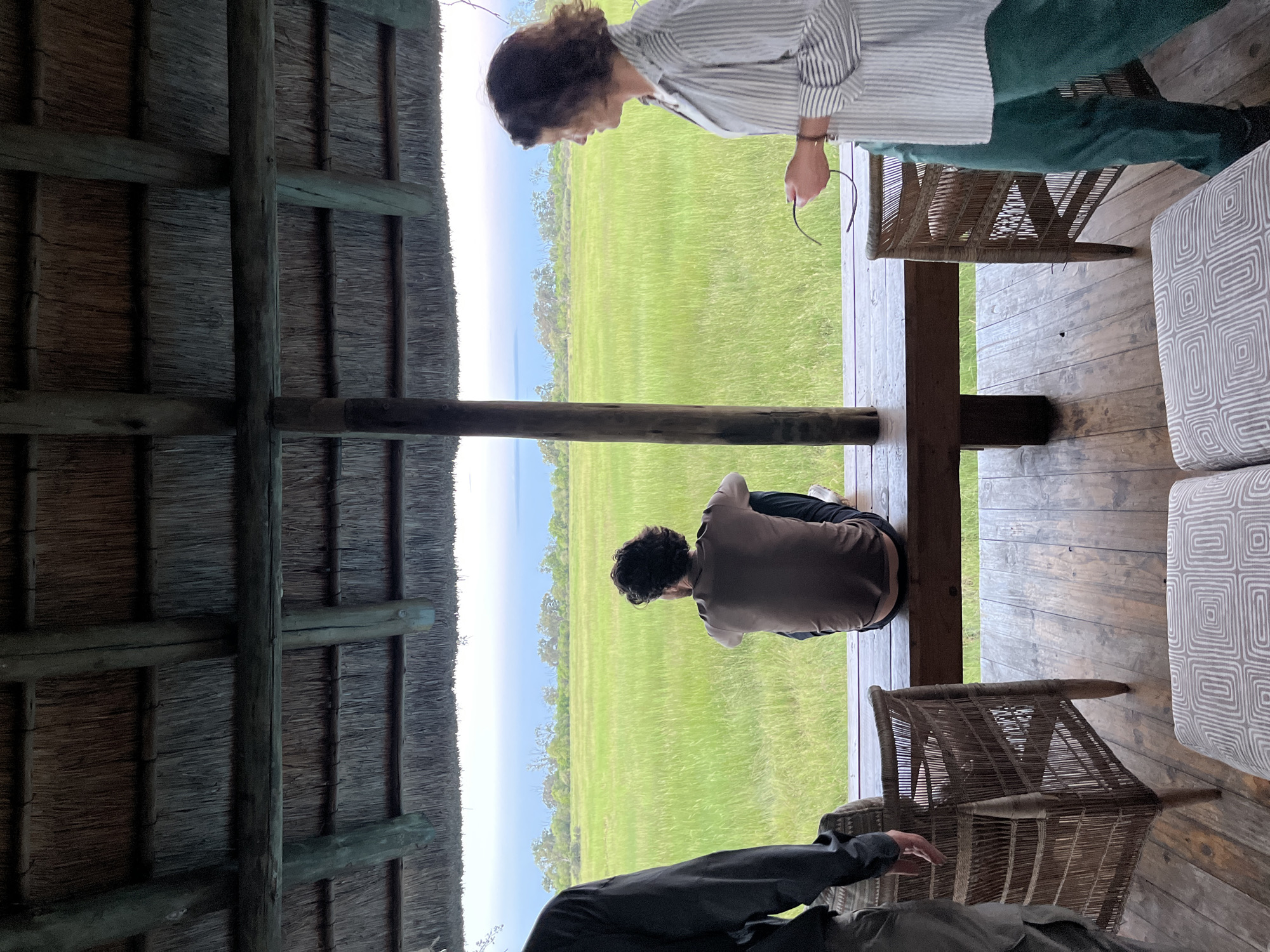 Two adults are on a wooden deck in an open structure with a thatched roof. One adult, wearing a striped shirt and green pants, stands and holds glasses. The second adult sits cross-legged facing a grassy plain that stretches to a distant treeline and a light blue sky. There are chairs and a cushioned seat on the deck. The setting is a safari camp in Khwai, Botswana.