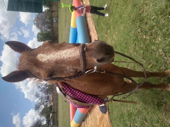 The image displays an outdoor scene in Nyeri, Kenya, under a blue sky with scattered white clouds. Centrally positioned in the foreground is a brown horse, facing forward. The horse exhibits a white blaze on its forehead and is fitted with a dark bridle and reins. A saddle, covered by a pink and black checkered saddle pad, is secured to its back. To the right, in the mid-ground, a child is visible standing near a multi-colored inflatable structure. The child is wearing a red and white striped long-sleeve shirt, dark trousers, and white athletic shoes, and has a green balloon hat shaped like an animal on their head. The inflatable structure, featuring blue, yellow, red, and pink sections, rests on a patch of brown earth and partially on green grass. In the background, a low concrete wall spans the mid-distance, behind which are various trees, some displaying purple blossoms, and a large green metal billboard structure on the far right. The immediate ground consists of green grass with some drier patches.