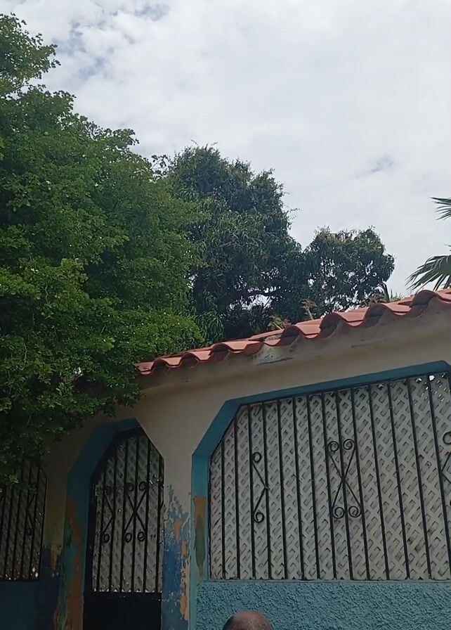 A low-angle shot shows a building with a light blue wall and a row of black metal bars for windows. There's a red-tiled roof above the wall. Next to the building is a large, leafy green tree. A man with thinning hair, wearing a blue shirt and carrying a backpack or bag, is briefly visible in the bottom of the frame. The sky is visible above, with white clouds scattered across it. The camera seems to be positioned from inside a moving vehicle.