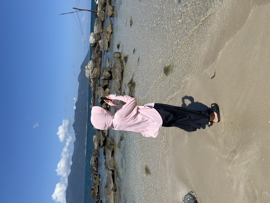 The scene depicts a sunny coastal landscape in Vĩnh Lương, Vietnam. One individual is observed from behind, standing on a light brown sandy beach, facing the ocean and a distant range of mountains under a clear blue sky with scattered white clouds. The person is dressed in a light pink long-sleeved hooded top that covers their head and neck, dark black loose-fitting pants, and dark slide sandals. Both hands are raised, holding a dark-colored smartphone, positioned as if capturing a photograph or video of the expansive view. The immediate foreground features wet sand transitioning into shallow, clear water with visible ripples and submerged small rocks. Numerous larger, dark grey rocks are scattered across the shallow water and further into the light blue sea. A rudimentary structure consisting of two dark wooden poles connected by horizontal lines is visible on the right side, extending from the water. The sun casts a distinct shadow of the person onto the sand to their right.