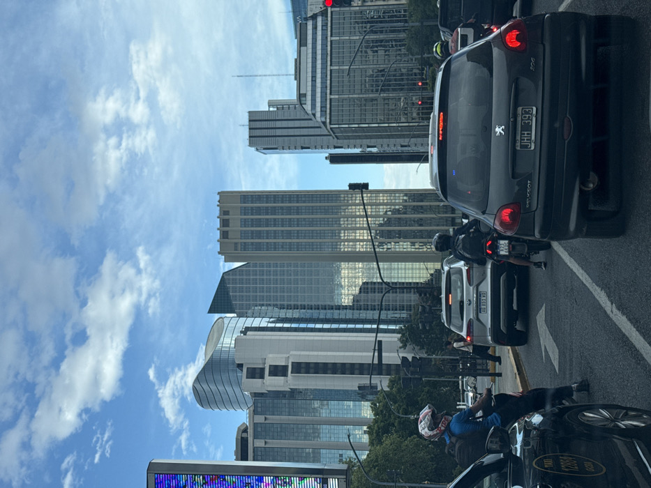 An urban street scene with heavy traffic is viewed from inside a vehicle. Tall, modern skyscrapers rise against a blue sky with scattered clouds. A black Peugeot car is directly in front, followed by a white SUV, and a motorcycle. A taxi and a motorbike are visible in the foreground, with a rider wearing a helmet. The scene suggests a busy city with high-rise buildings and congested streets.