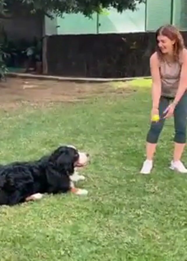 A woman on a grassy lawn smiles and offers a tennis ball to a large Bernese Mountain Dog that is lying down. The woman wears a tan top, dark green cropped leggings, and white tennis shoes. The dog is black with white and brown markings on its face and legs. The background features a green yard, a dark stone wall, and trees. The woman extends her arm towards the dog, holding the tennis ball in her hand.