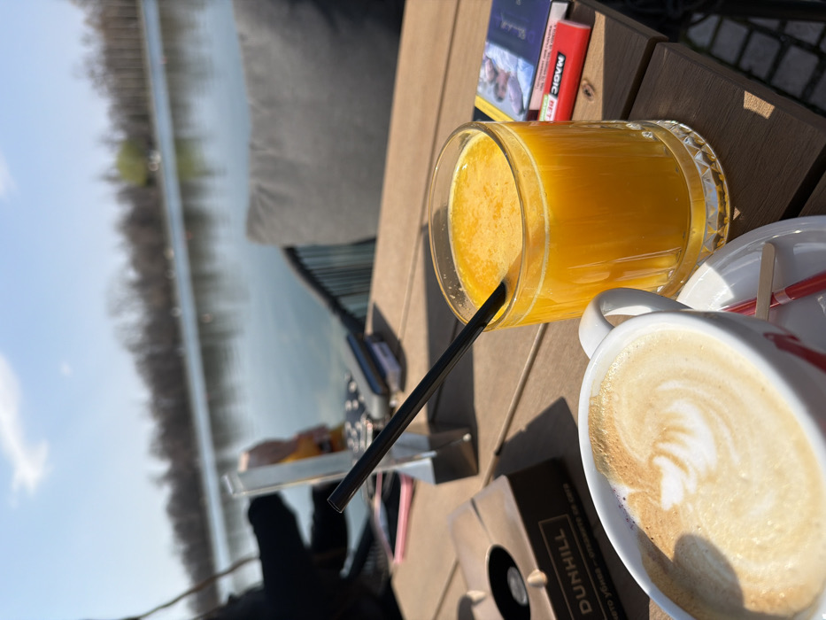 The scene depicts an outdoor cafe setting on a sunny day, specifically located by the Rowing Canal (Grebna Baza) in Plovdiv, Bulgaria. In the immediate foreground, a white ceramic cup containing a latte with visible latte art rests on a white saucer with two red stirring sticks. Adjacent to it, a clear glass filled with orange juice, containing a black plastic straw, sits on a light brown wooden slatted table. Further back on the table, to the left of the orange juice, a cigarette pack (Marlboro Gold/Touch) and a red "MAGIC BET" lighter are visible. To the left of the latte cup, a brown "DUNHILL" branded ashtray is present. A pink smartphone is partially visible on the table further to the left. A silver rectangular menu holder or sign and another dark object are also on the table. In the midground, a person wearing a dark sleeve is partially visible to the left, seated at the table. To the right, a dark grey cushioned outdoor chair is visible. The background features the wide, calm surface of the Rowing Canal, reflecting a clear blue sky with a few sparse white clouds. The opposite bank of the canal is lined with numerous bare deciduous trees, indicating a cool-season landscape.