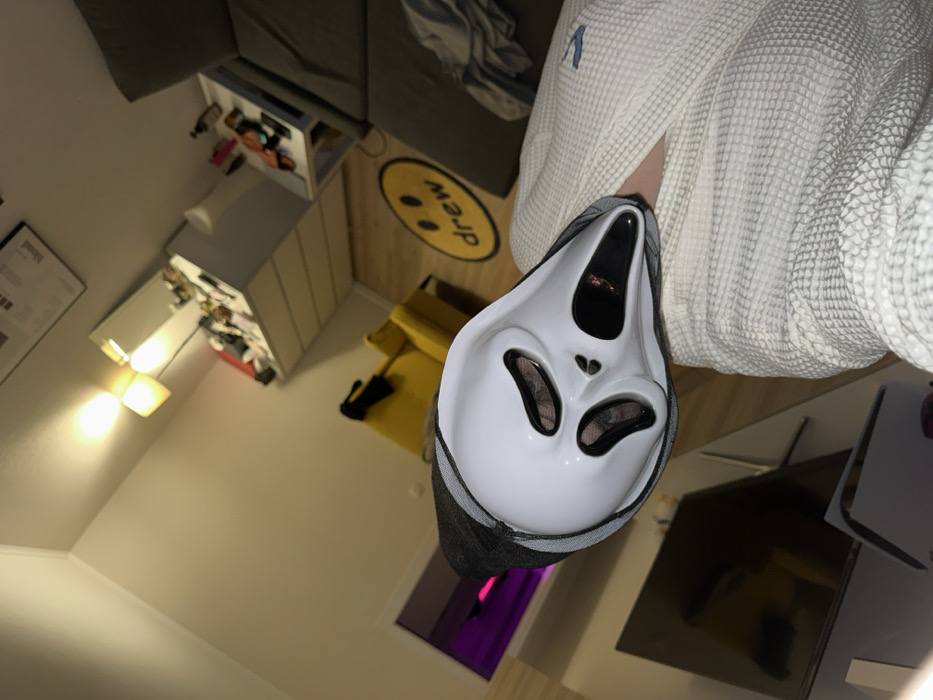 The image depicts an interior room in Vsevolozhsk, Russia, viewed from a slightly elevated and angled perspective. A person's body is partially visible in the foreground, wearing a white, textured robe with a blue embroidered logo on the upper left chest. Their face is obscured by a white plastic "Ghostface" mask, with the subject's eyes visible through the dark eyeholes. The room features light-colored walls and wood-toned flooring, illuminated by artificial warm-toned light from a ceiling fixture. In the left background, a black flat-screen television rests on a light-colored media console, with a white PlayStation 5 console positioned vertically beside it. Further back and to the left, a bright yellow armchair is present, draped with a dark item of clothing. An open doorway beyond the armchair reveals a space illuminated with a purple-pink light. In the right background, a large gray sectional sofa is visible, with a light-colored textile draped over a portion of it. Adjacent to the sofa, a small white side table holds various small objects. Against the far wall, a white chest of drawers with multiple visible drawers is topped with a mirror and an assortment of items including bottles and accessories. A framed item hangs on the wall above the chest of drawers. On the floor between the yellow armchair and the gray sofa, a circular yellow rug features a black smiley face logo with the word "drew."