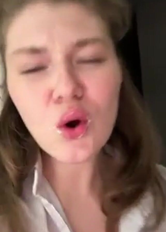 A woman with brown hair, wearing a white button-down shirt, is seen in a close-up video. Her hair is styled in loose waves, and her makeup is subtle. She puckers her lips, revealing a white substance around her mouth, possibly toothpaste or a skincare product. After puckering, she smiles. The background is blurred, suggesting an indoor setting, possibly a bedroom or bathroom, with a door or window visible.