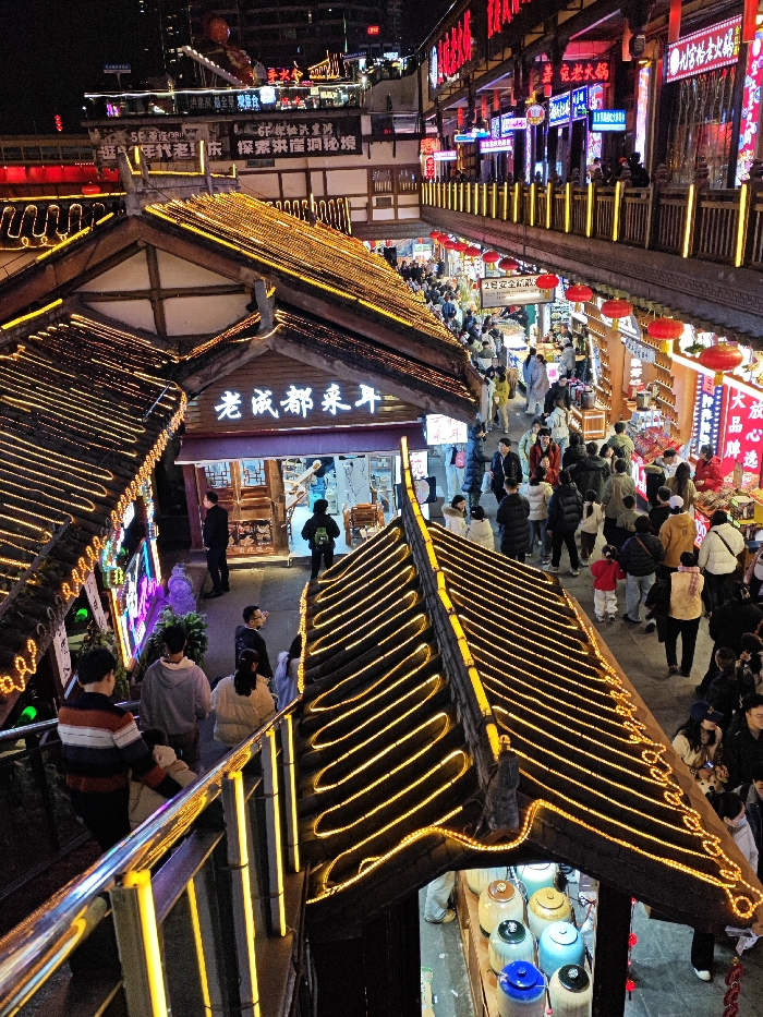 The image depicts a multi-tiered commercial and pedestrian area at night, identified as Hongyadong Commercial Street in Yuzhong District, Chongqing, China. The scene is densely populated with a large crowd of pedestrians across multiple levels. The environment features traditional Chinese architectural elements, including dark tiled roofs with upturned eaves, extensively outlined by bright golden LED strip lighting. Buildings are constructed with dark wooden beams and columns, contrasting with lighter-colored wall sections. Numerous storefronts are visible, displaying vibrant neon signs in red, blue, purple, and white, primarily featuring Chinese characters. One prominent shop sign reads "老成都来井" (Old Chengdu Lai Jing). Red traditional Chinese lanterns hang at various points, contributing to the ambient illumination. Pedestrian walkways and a visible staircase, equipped with railings also illuminated by yellow LED strips, connect the different levels. On a lower level, beneath one of the illuminated roofs, multiple ceramic jars or pots of various colors (e.g., brown, white, blue, green) are displayed as merchandise. In the background, taller modern urban buildings with illuminated windows are discernible. The numerous people, including adults and children, are dressed in winter clothing such as jackets and coats. They are engaged in walking, standing, and observing the surroundings, creating a bustling atmosphere. No specific focused interactions or actions beyond general pedestrian movement are discernible within the crowd. The entire scene is brightly lit by artificial light sources, predominantly the golden LED strips and colorful neon signs.