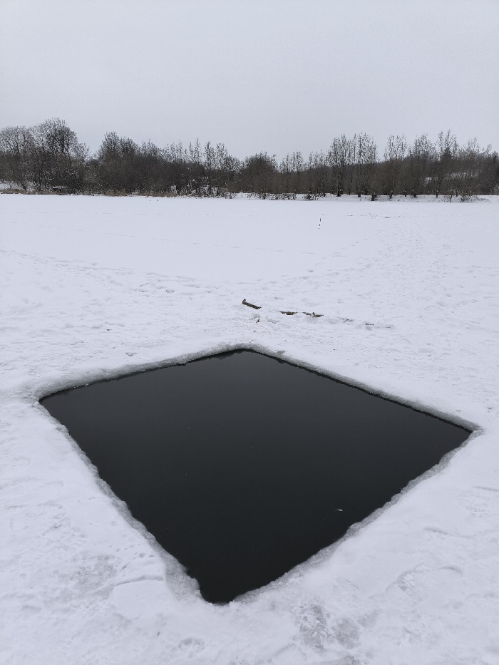 The image displays a desolate winter landscape in Parkhomivka, Ukraine, under a uniformly overcast sky. The primary subject is a large, rectangular opening cut into a thick expanse of snow-covered ice, revealing dark, still water beneath. This ice cut, positioned centrally in the lower frame, appears to be approximately 2 meters in width and 2 meters in length. The edges of the ice surrounding the cut are sharp and slightly uneven, with fragments of ice visible. Footprints are discernible in the fresh snow leading to and around the perimeter of the opening. Approximately 1.5 meters behind the ice cut, two bare branches or sticks lie horizontally on the snow. The background consists of a dense, linear grouping of leafless deciduous trees and bushes, suggesting a distant shoreline or bank, stretching across the horizon. No human figures or other prominent objects are present within the scene.