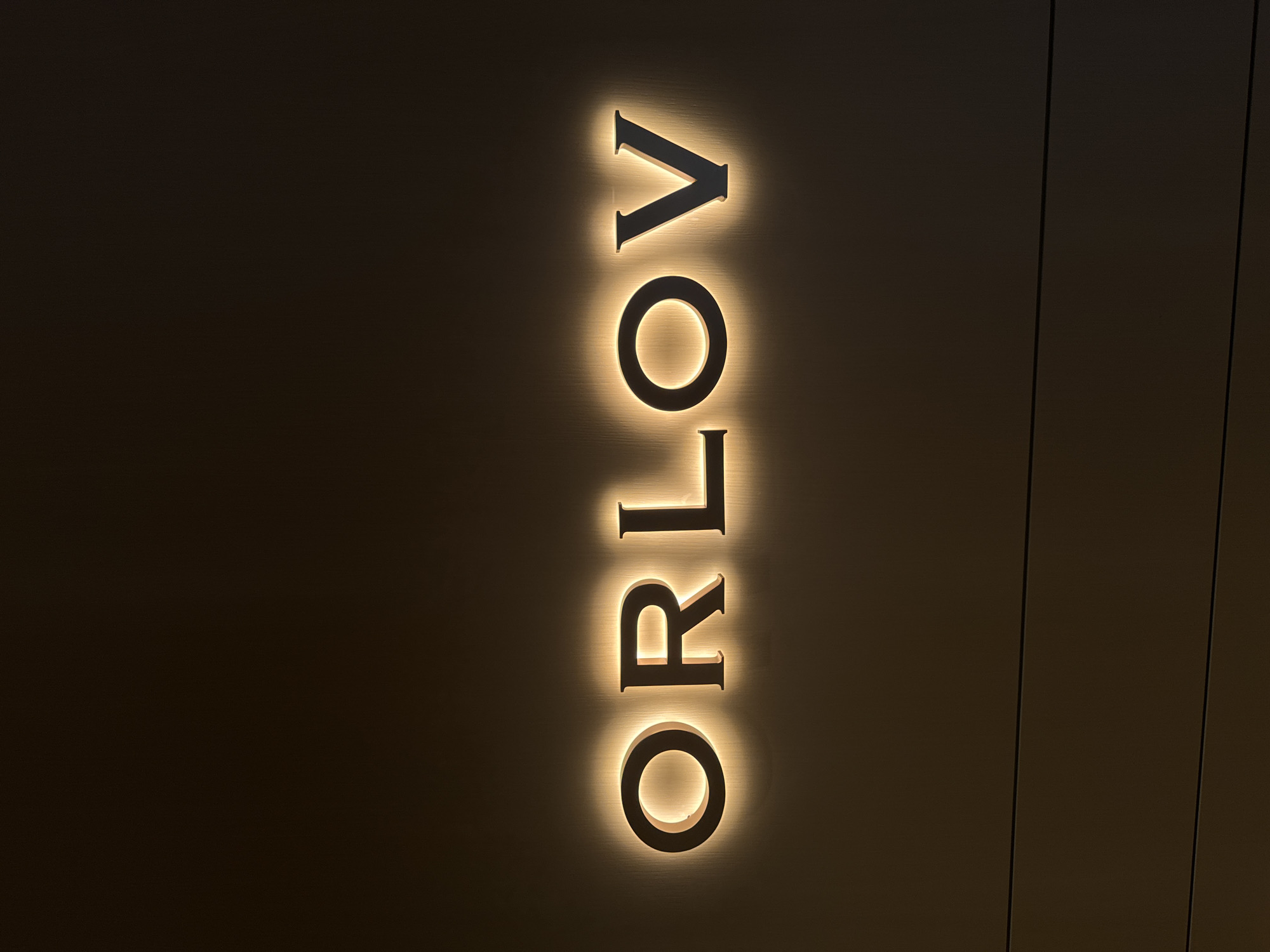 n illuminated sign reading "ORLOV" vertically aligned on a wall