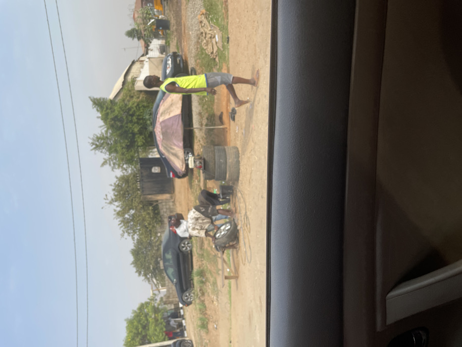 The image depicts an outdoor tire repair or service area in Kagini, Nigeria. The foreground is partially obscured by the dark brown interior door panel of a vehicle, from which the photograph was taken. In the mid-ground, two male individuals are actively engaged in working on a tire positioned on the unpaved, light brown earth. One man, wearing a patterned shirt and dark shorts, is bending over the tire. Another man, in dark attire, is positioned near him, also attending to the task. Adjacent to their workspace, a stack of three black tires serves as a base for a small, red-and-white gasoline-powered engine or generator. A faded, multi-colored umbrella (purple and tan) is erected over this equipment, providing shade. An air hose or cable extends from the immediate work area to the left. To the right of the working individuals, a young male wearing a bright yellow sleeveless shirt and grey shorts walks barefoot or in light flip-flops from left to right across the dusty ground. In the background, several dark-colored sedans are parked on slightly elevated, unpaved terrain. A black sedan is visible on the left, with additional indistinct figures gathered near it. Another dark sedan is partially visible behind the umbrella. Further in the background, a low-rise building with a light-colored roof and a darker building with a substantial dark gate are present. Green trees and sparse vegetation punctuate the scene, and utility wires are visible against a clear, light blue sky. A small yellow vehicle, possibly a tricycle, is faintly discernible in the far right background. The overall environment suggests an informal commercial setting under natural daylight.