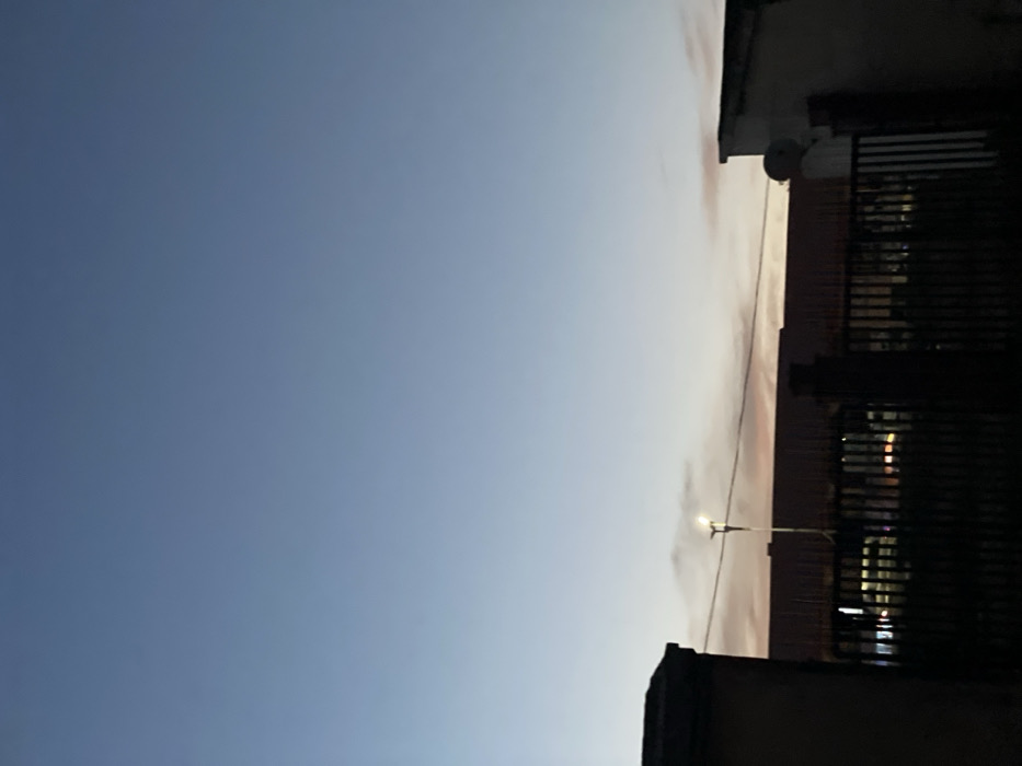 The image depicts an outdoor scene in Jos, Nigeria, at twilight. The sky dominates the upper two-thirds, transitioning from a light blue overhead to a faint orange and pink hue near the horizon, indicative of dusk or dawn. Scattered, wispy clouds are visible in the lower sky. The foreground is framed by dark, silhouetted architectural structures on the left and right, likely sections of a wall or building. A dark, horizontal metal gate with vertical bars spans the lower portion of the image, extending between these structures. Beyond the gate, multiple low-rise buildings are visible in silhouette, characterized by their dark rooflines. Centered above these roofs is a tall, slender pole topped with an illuminated, bright white streetlight. A dark, thin wire or cable runs horizontally across the mid-ground, passing near the streetlight. Several diffused, artificial light sources are discernible in the background, appearing as small, bright blurs behind the gate and structures, suggesting distant lights or illuminated interiors. No individuals or specific actions are discernible.